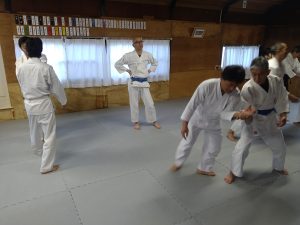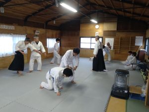 本日(2月15日)の第2部の稽古では、体操・転換法・横面打ち入身投げ・肩取り二教・片手取り内回転回転投げ・突き小手返し・座技呼吸法の各技について稽古を行いました。