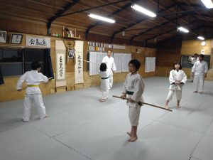 本日(4月7日)の稽古では、体操・西尾流刀法居合 四本目 後切り・転身法(横面打ち)・演武会稽古(片手取り四方投げ・正面打ち入身投げ・正面打ち一教)・座技呼吸法の各技について稽古を行いました。