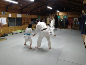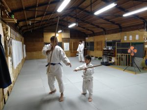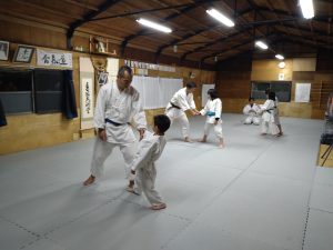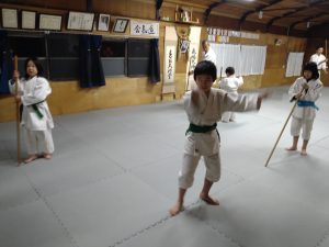 本日(4月16日)の稽古では、体操・13の杖(素振り・合わせ)・転換法・(半身半立ち)突き三教・正面打ち回転投げ・座技呼吸法の各技について稽古を行いました。