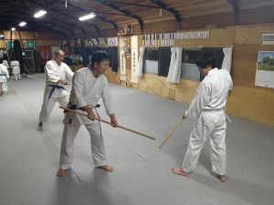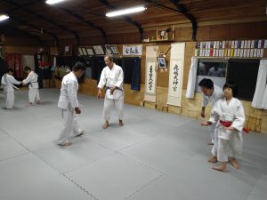 本日(9月11日)の稽古では、体操・31の杖(素振り・合わせ)・13の杖(素振り・合わせ)・転換法・突き小手返し・横面打ち入身投げ・座技呼吸法の各技について稽古を行いました。