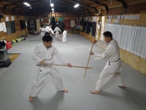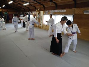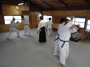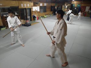 本日(1月22日)の稽古では、体操・13の杖(素振り・合わせ)・四方斬り・逆半身両手取り天地投げ(入身・転進・転換)・肩取り二教・横面打ち小手返し・座技呼吸法の各技について稽古を行いました。