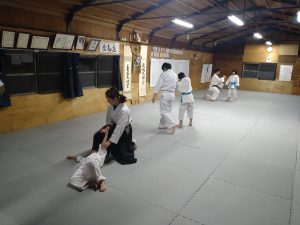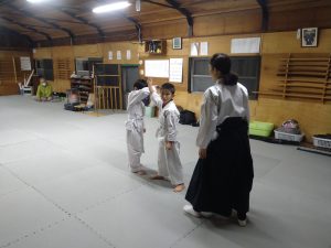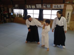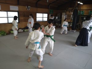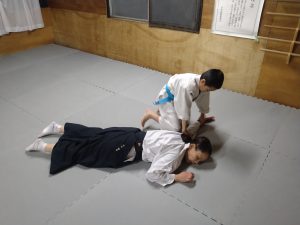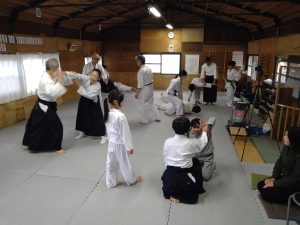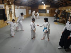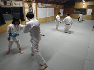 本日(1月18日)の第1部(少年部・初心者)の稽古では、体操・内回転背伸運動・両手取り四方投げ・横面打ち一教・少年部六級審査技演武・片手切り離し天秤投げ・座技呼吸法の各技について稽古を行いました。