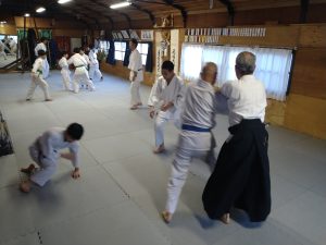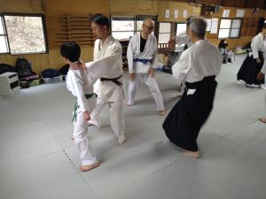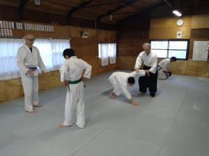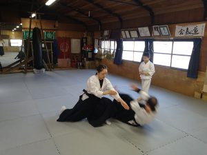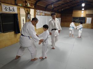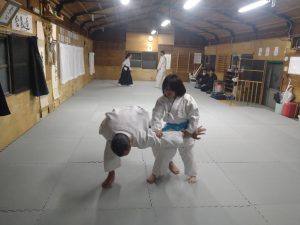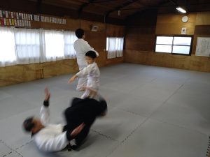 本日(1月18日)の第1部(一般部)の稽古では、体操・内回転背伸運動・突き入身投げ三種(入身・転換・転進)・後両手取り一教・少年部六級審査技演武・片手切り離し天秤投げ・座技呼吸法・の各技について稽古を行いました。