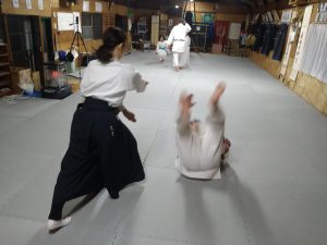 本日(2月5日)の稽古では、体操・13の杖(素振り・合わせ)・転換法・諸手取り入身投げ3種・横面打ち二教・横面打ち呼吸投げ2種・後両手取り小手返し・座技呼吸法の各技について稽古を行いました。