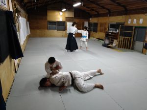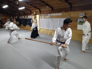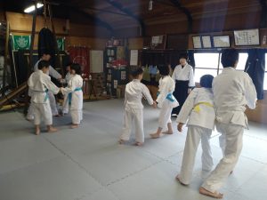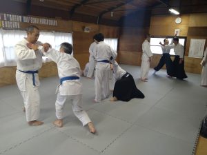 本日(12月18日)の稽古では、体操・13の杖(素振り・合わせ)・片手取り隅落とし・正面打ち二教・突き小手返し・呼吸投げ二種(片手取り・入身投げ)・座技呼吸法の各技について稽古を行いました。