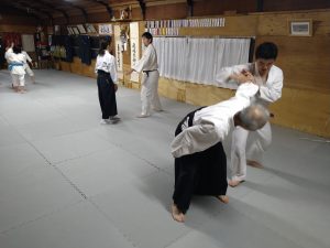 本日(1月11日)の一般部の稽古では、体操・転換法・半身半立ち片手取り四方投げ・横面打ち二教・肩取り面打ち呼吸投げ・肩取り面打ち小手返し・座技呼吸法・の各技について稽古を行いました。